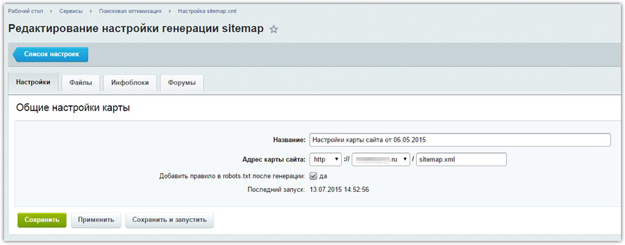 Здесь нам необходимо создать новую карту, адрес желательно указать http://www.сайт.ru/sitemap.xml, а также установить галочку у пункта «Добавить правило в robots.txt после генерации».