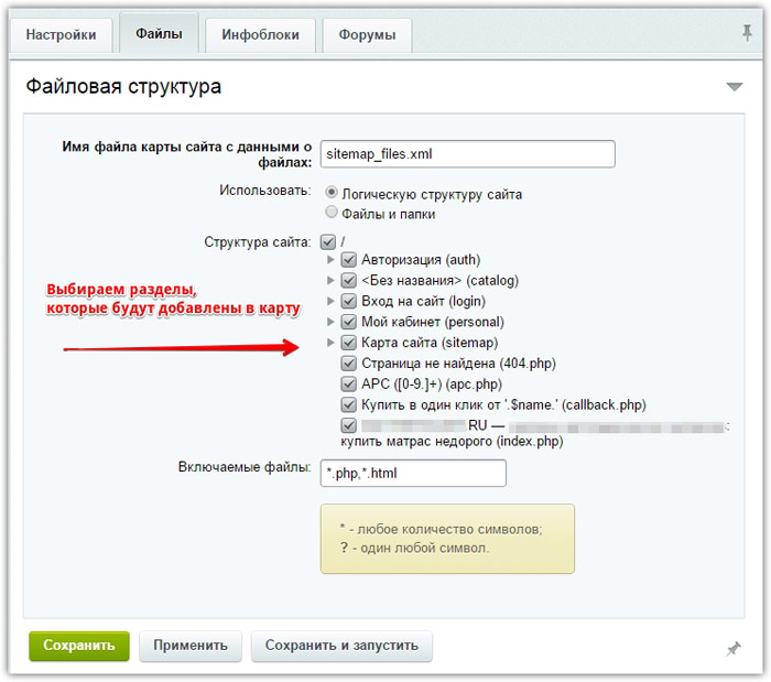 Во вкладке «Файлы» выбираем, какие файлы и разделы стоит добавлять в карту сайта. Главная особенность этого модуля в том, что карта сайта будет автоматически генерироваться и добавлять все новые страницы из выбранных разделов.