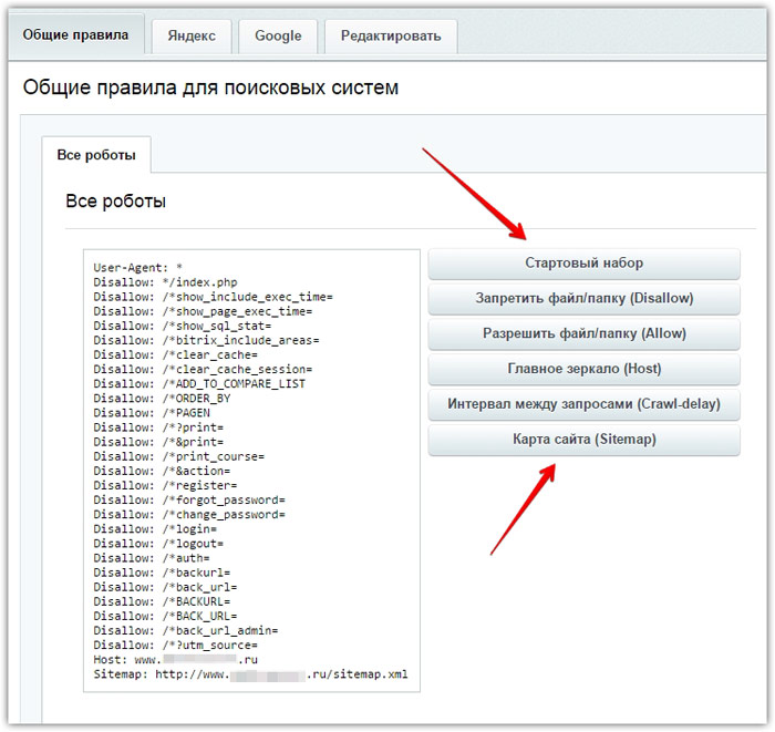С помощью специальных кнопок даже новичок сможет легко настроить правила: достаточно всего лишь нажать на кнопки «Стартовый набор» и «Карта сайта». Будет сгенерирован стартовый набор правил с учетом структуры 1С-Битрикс, в котором от индексации закрыты системные разделы, поиск и т.п. Сразу будет добавлена директива Host и Sitemap с указанием ранее созданной карты сайта.