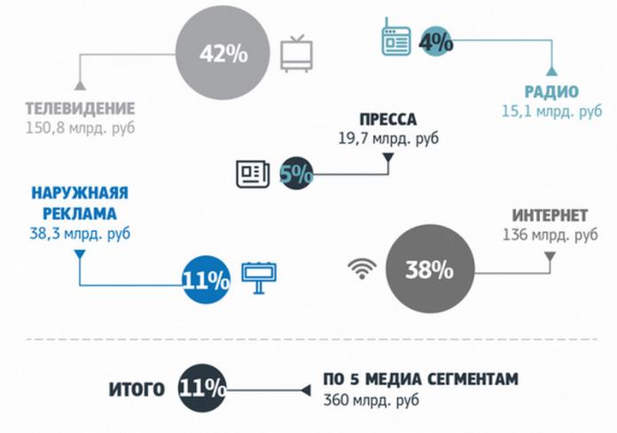 Самые большие темпы роста показал сегмент интернета, расходы рекламодателей на продвижение в сети в прошлом году выросли на 21% до 136 млрд руб. Доля интернет-рекламы на рекламном рынке составила 38%: