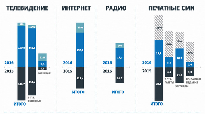 Единственный падающий сегмент – это рынок рекламы в средствах массовой информации. Рекламодатели сократили продвижение средств на рекламу в печатных СМИ на 16% до 19,7 млрд руб.