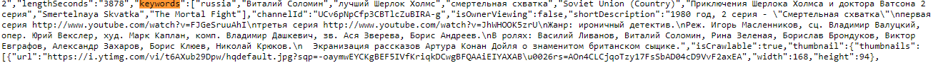 Чтобы увидеть теги видео, нужно просмотреть исходный код страницы. В Google Chrome это можно сделать с помощью пункта «Просмотреть код страницы» в контекстном меню, вызываемом правой кнопкой мыши. В коде нужно найти ключевые слова (Keywords). Они и будут тегами для этого видео. Например, у фильма про Шерлока Холмса, ключевые слова такие: