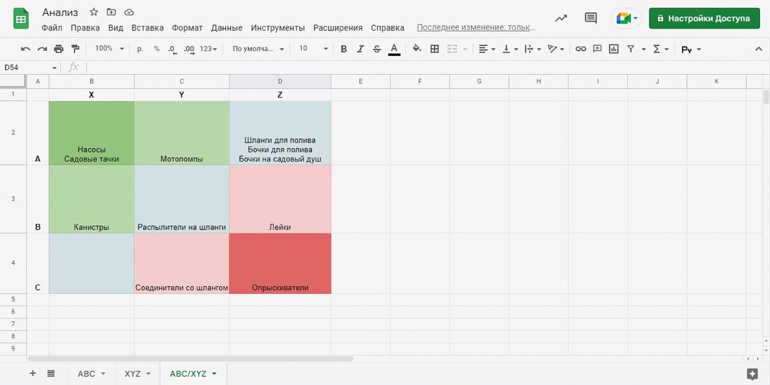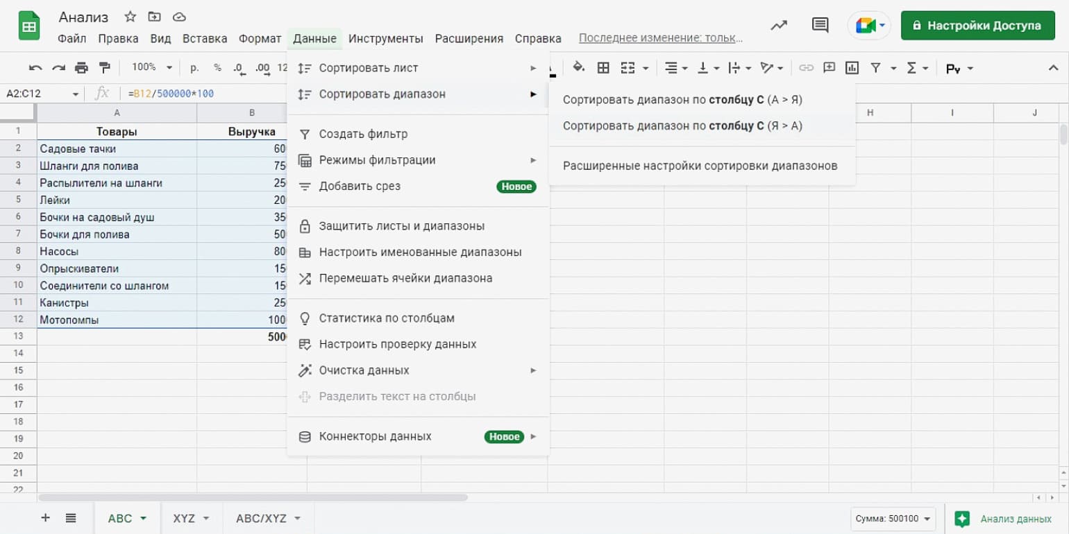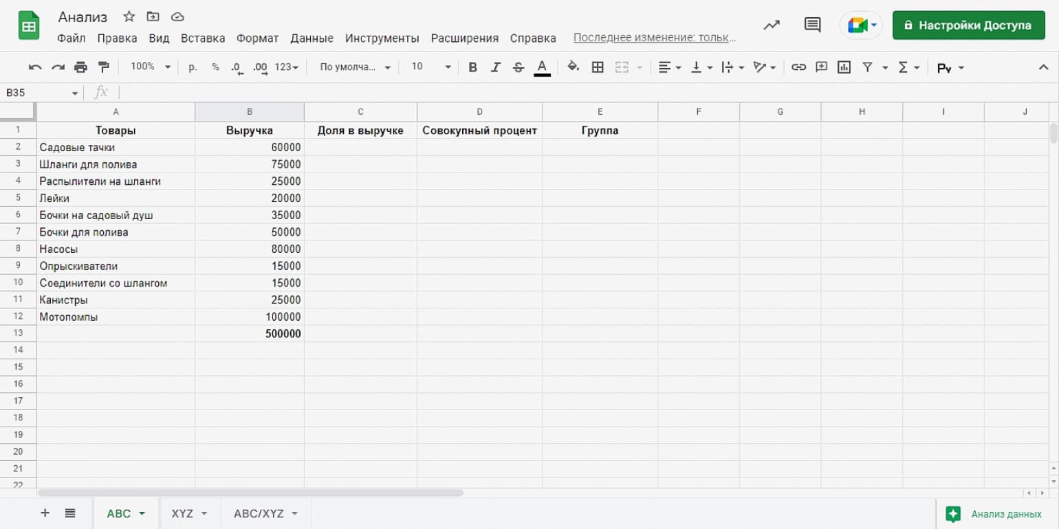 ABC/XYZ-анализ можно провести в Excel или «Google Документах». Мы покажем процесс на примере магазина садовых принадлежностей. Проводить анализ будем в три этапа: ABC-анализ, XYZ-анализ и построение матрицы ABC/XYZ.
