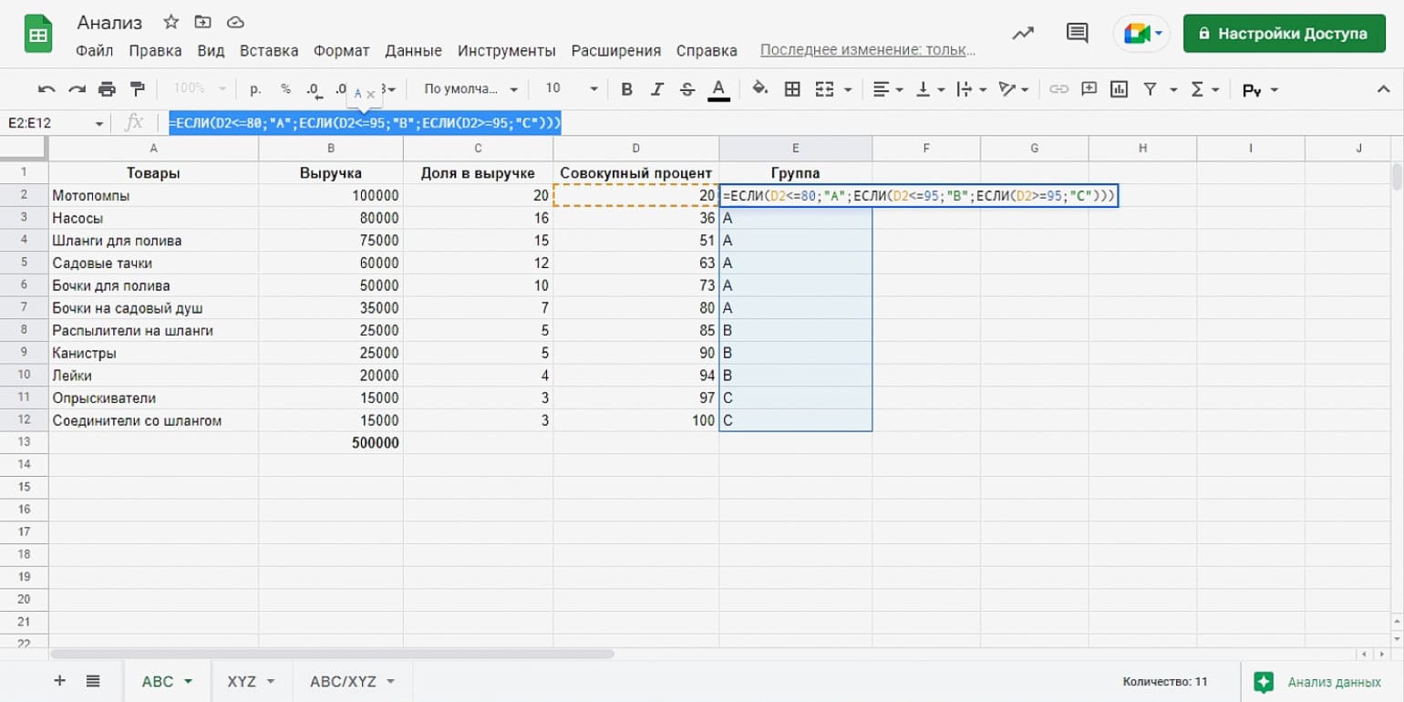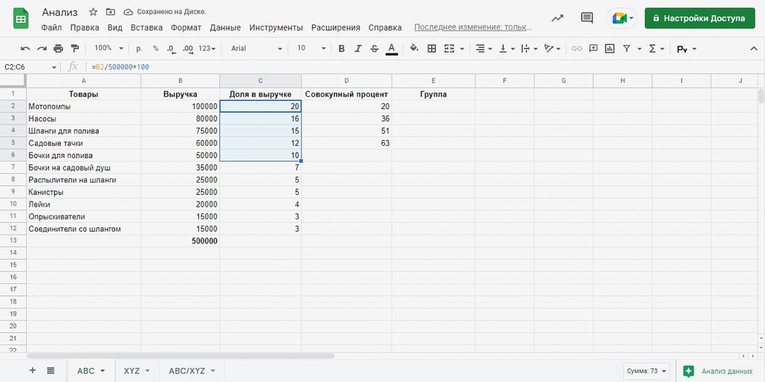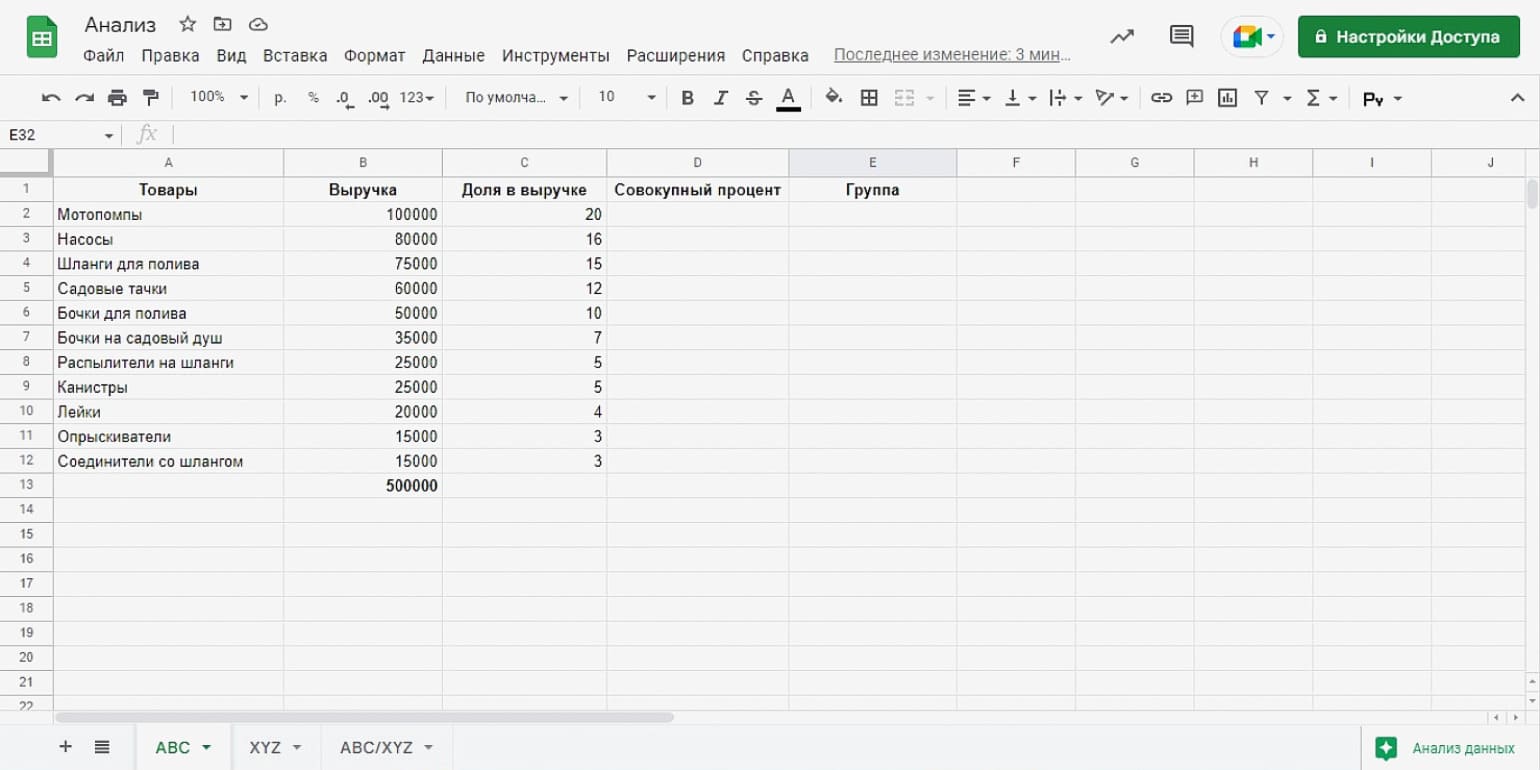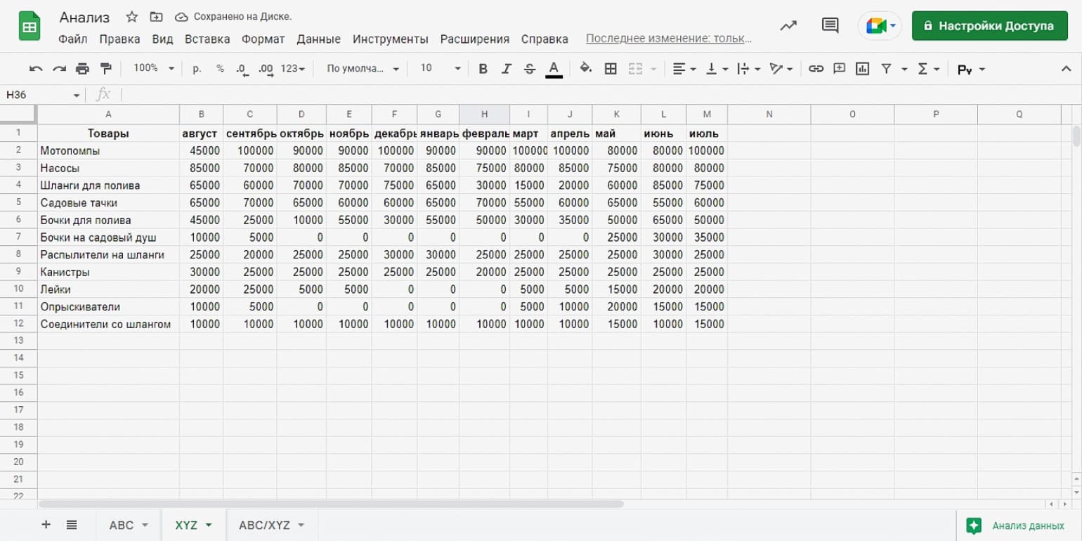 ABC/XYZ-анализ можно провести в Excel или «Google Документах». Мы покажем процесс на примере магазина садовых принадлежностей. Проводить анализ будем в три этапа: ABC-анализ, XYZ-анализ и построение матрицы ABC/XYZ.