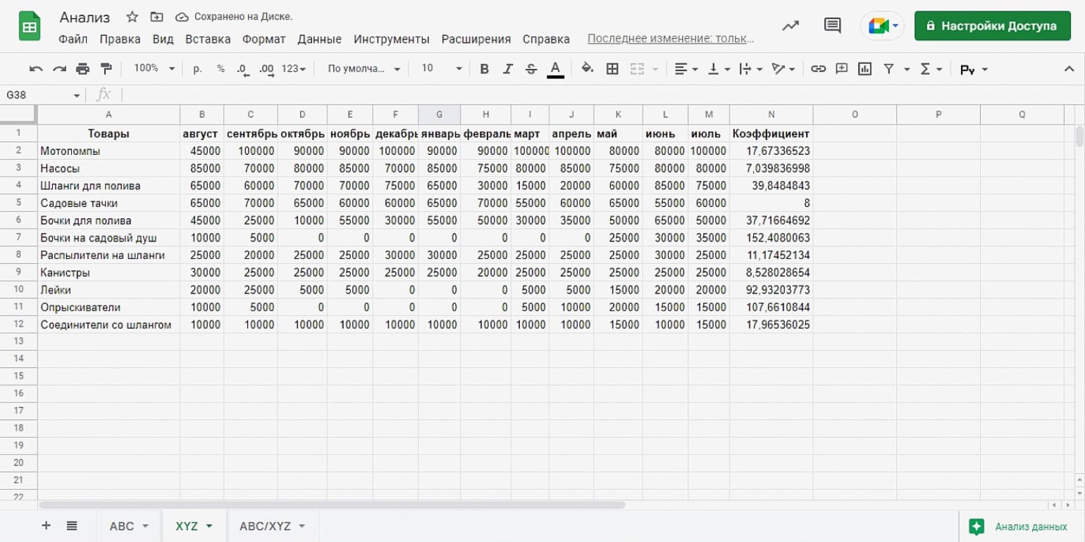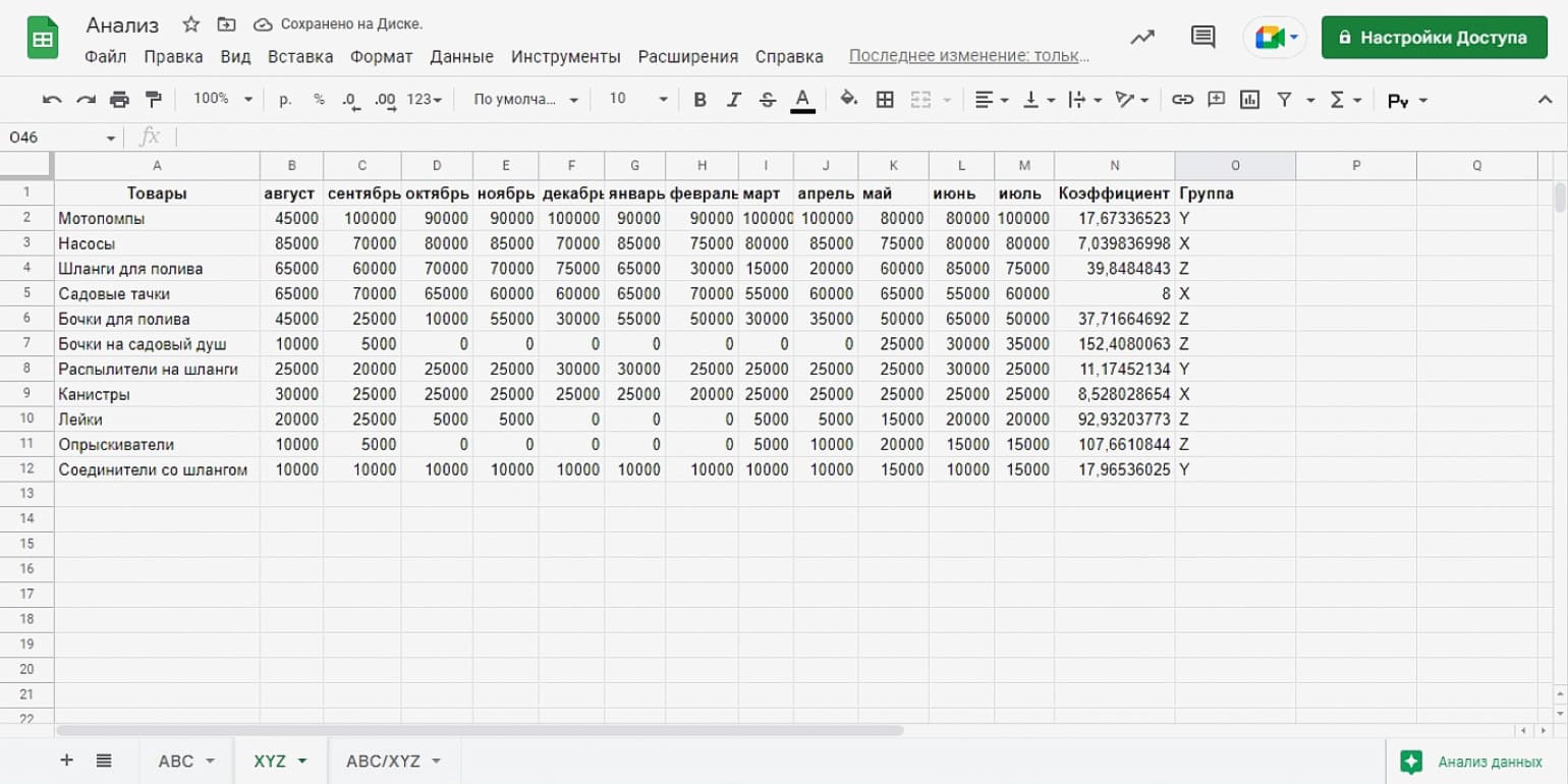 В таблице для XYZ-анализа больше столбцов. Создать её можно на втором листе.