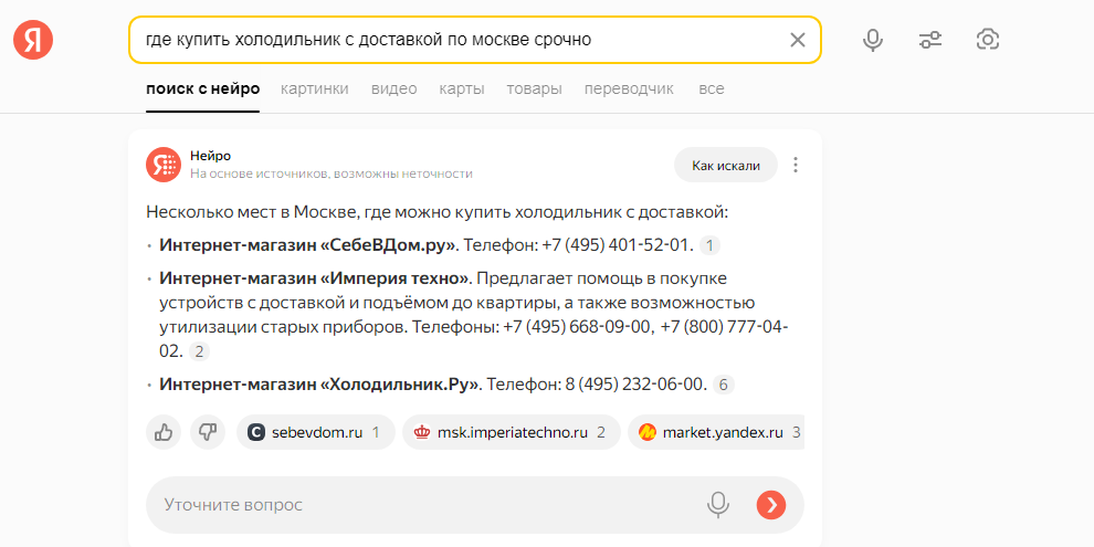Генеративный ответ Яндекс Нейро на коммерческий запрос