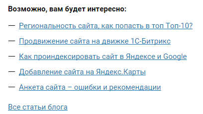Мы это сделали не просто так. Эта маленькая хитрость позволяет увеличить глубину просмотра Блога, не давая пользователям быстро уйти с сайта (надеемся, вас тоже зацепят заголовки других статей и вы не ограничитесь прочтением одной ;) ), а также качественно перелинковывает сайт, улучшая индексацию.