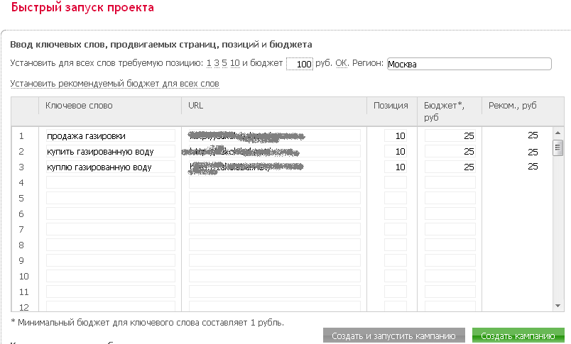 - В поле «Ключевое слово» прописываете собранные ключевики