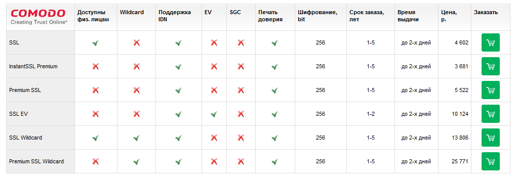 Сегодня вебмастерам доступны разные виды SSL-сертификатов от компаний Symantec, GeoTrust, Thawte, Comodo, TrustWave и пр. Цены колеблются от 1000 до 80 000 руб./год и зависят от размера ключа шифрования, наличия поддержки интернационализированных доменных имен (вот вам и еще один минус кириллических доменов), доступности физлицами и т.д. Вот пример расценок на SSL-сертификаты от Nic.ru и REG.RU.
