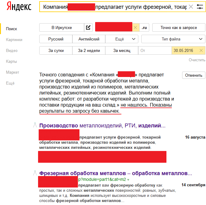 Аналогично работают операторы поиска, например, Google. Всё, что нужно сделать, перенести в поисковое поле site:имя_домена «запрос». Если дублированный контент есть, он будет показан.