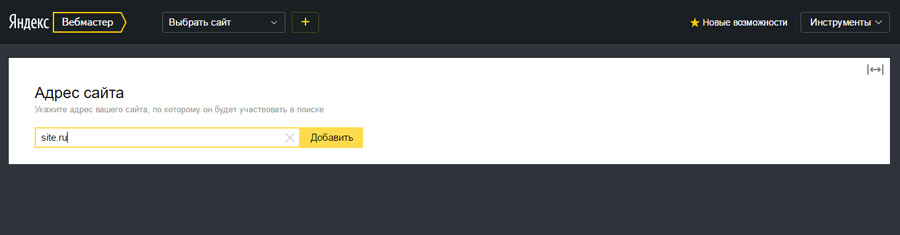 Для начала эффективной работы над выполнением задачи по добавлению веб-сайта в Яндекс нужно зарегистрировать аккаунт в этой поисковой системе или авторизироваться, если он у вас уже есть. После этого вы сможете попасть в сервис Яндекс.Вебмастер и добавить сайт, перейдя по одноимённой ссылке. В открывшейся вкладке нужно ввести адрес сайта и нажать кнопку «Добавить».