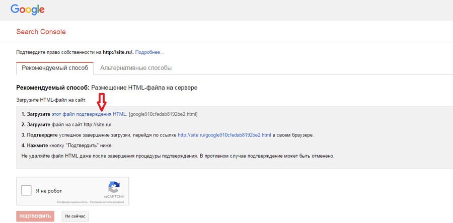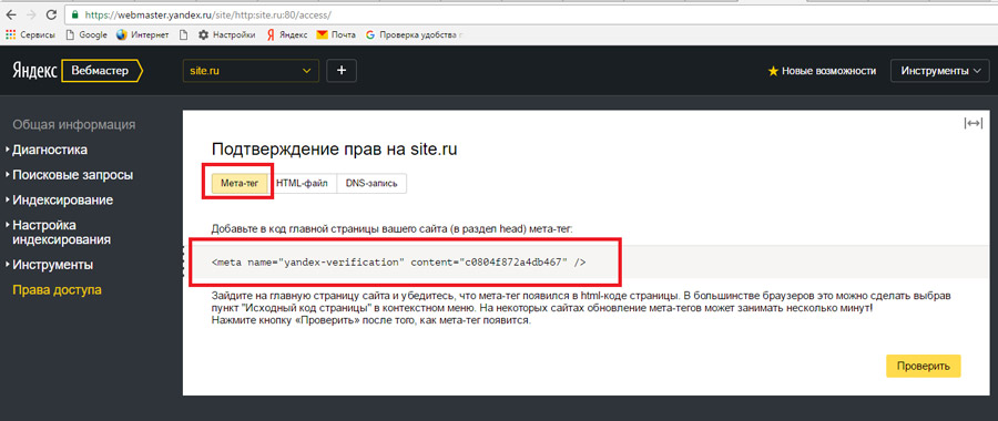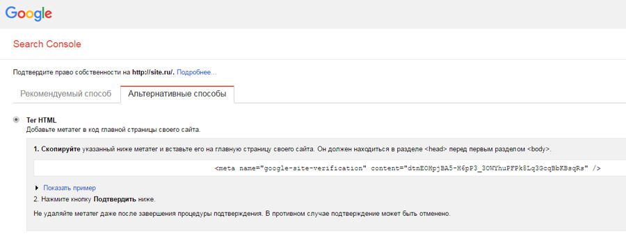 Суть обоих − подтверждения через файл html и мета-тег − состоит в том, что на сайте нужно разместить ключ. Если это получится сделать, значит, права на сайт подтверждены.