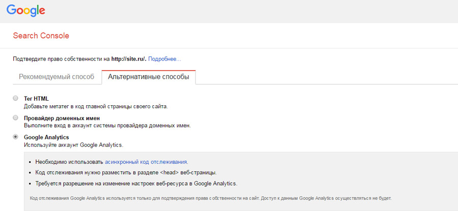 Далее от вас потребуется подтверждение прав на веб-ресурс. Выберите для решения этой задачи один из возможных вариантов: