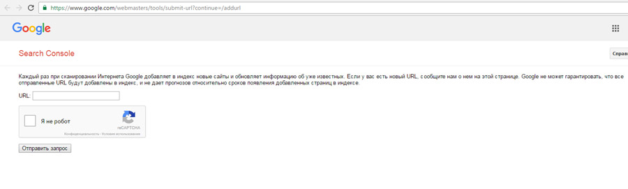 Ещё один вариант сообщения о новом URL − введение в поле Search Console адреса, капчи и отправка запроса. Вход тоже выполняется через свой аккаунт.