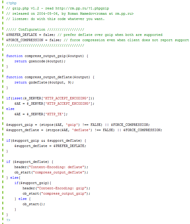 Переименовываем в gzip.php, и помещаем в каталог с сайтом. После этого добавляем такую строчку: