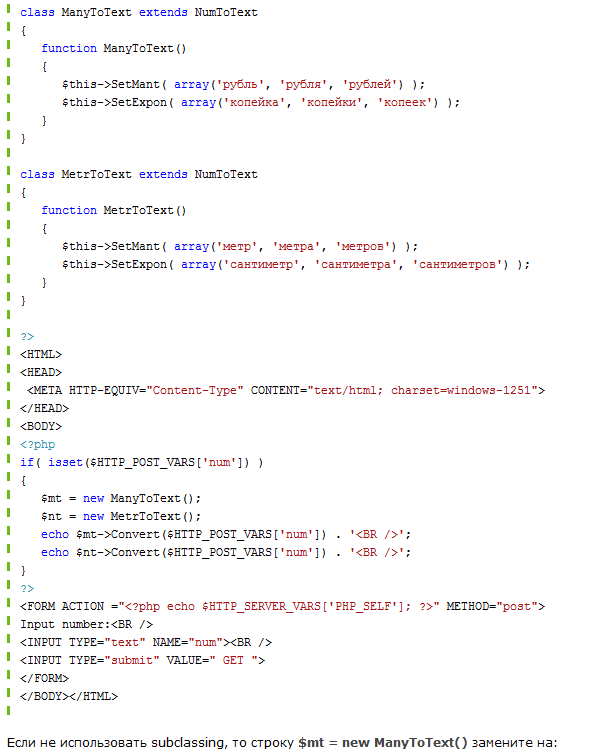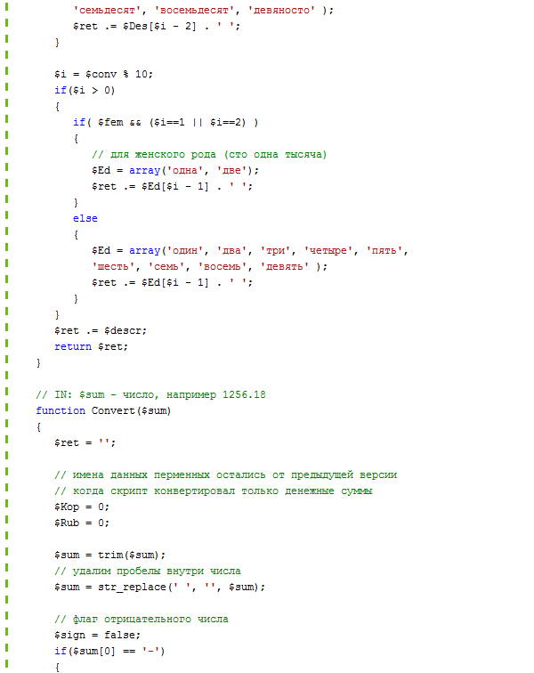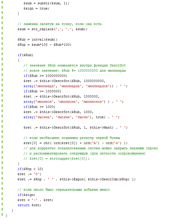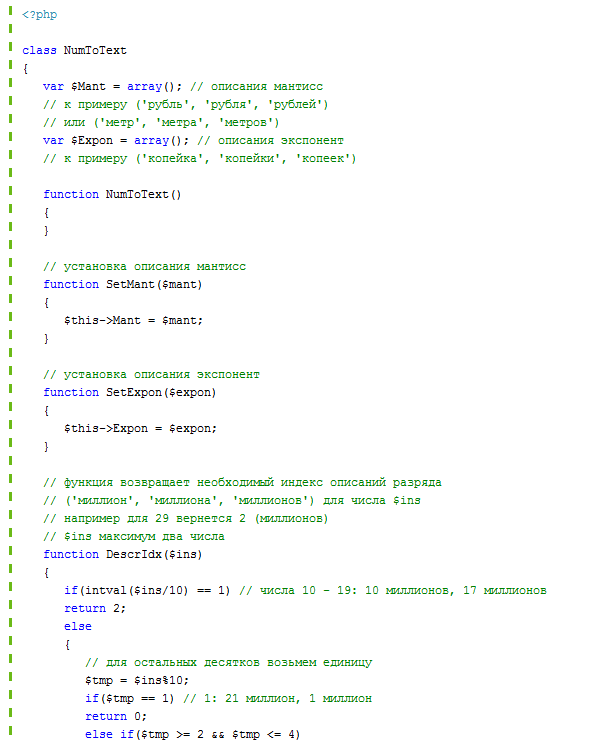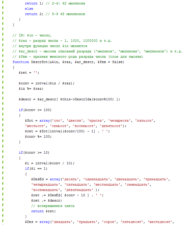 Данный скрипт реализует преобразование чисел в текст, т.е., на примере денежной суммы, из 1256.18 получим Одна тысяча двести пятьдесят шесть рублей 18 копеек. В этом классе всё настолько прозрачно, |
