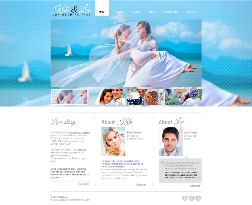 - Оригинальный дизайн. Если сайты компаний практически всегда исполнены в строгом стиле, то свадебные ресурсы не подчинены никаким рамкам. Интересные дизайнерские решения, богатая цветовая гамма, флеш-анимация, необычные шрифты − всё это характерно для свадебных сайтов.