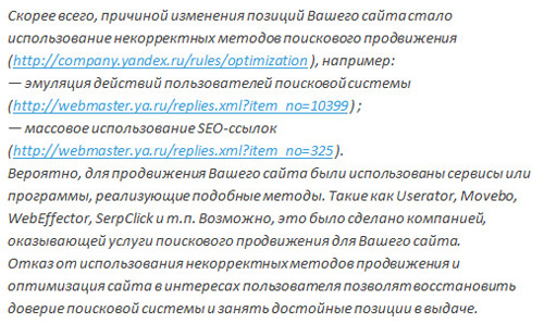 Если вас поймают на использовании подобных методов, а вероятность этого очень высока, будут санкции – понижение позиций в выдаче. Вот какой ответ на этот счет дает Яндекс: