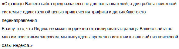 Поисковики считают, что такие сайты «захламляют» Интернет, поэтому за продвижение дорвеями можно резко и серьезно просесть в выдаче или вовсе вылететь из индекса. Например, Яндекс присылал пользователям, активно применяющим подобный метод, следующие сообщения: