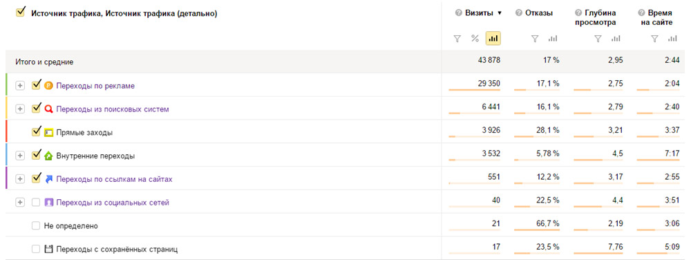 Важно: если в Сводке нет какого-либо типа источников, то он либо совсем не приносит трафика (например, не используется реклама), либо не настроен (для случая с отделением трафика с рассылок – нужны специальные метки в ссылках из писем).