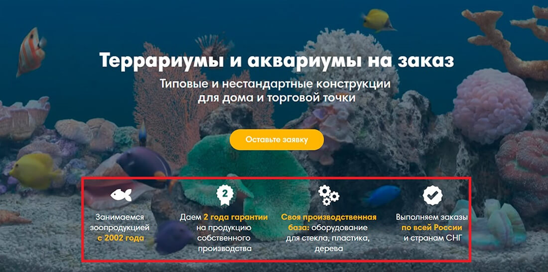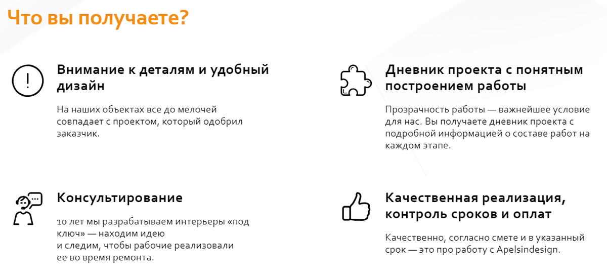 Преимущества для клиента тоже можно отразить во втором экране, даже если они уже были на первом. Здесь о выгодах можно рассказать более подробно, но всё равно сжато, например, в виде иконок.