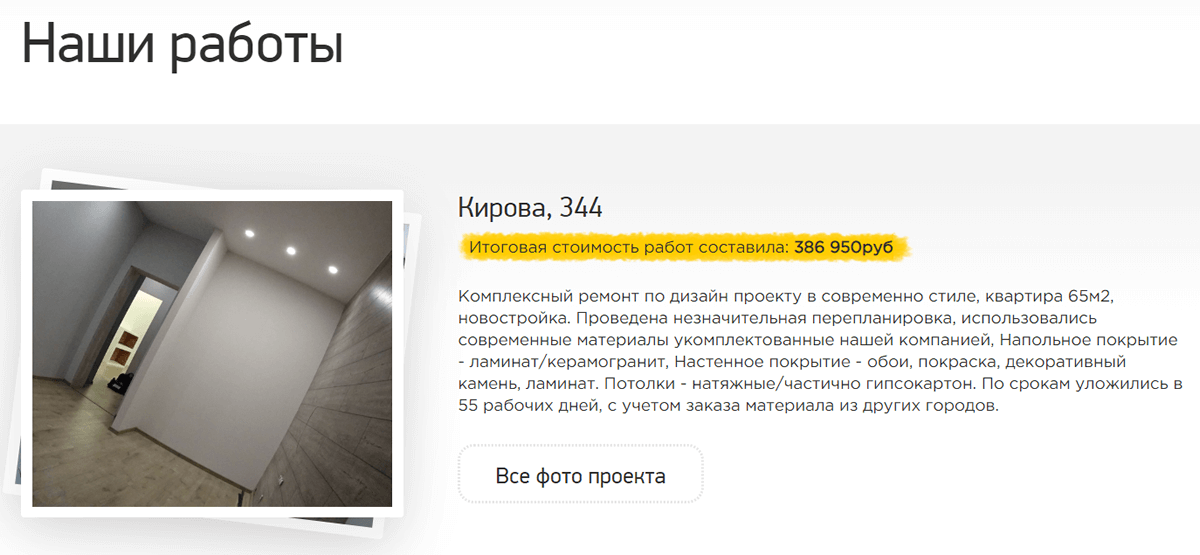 Не будет лишним продемонстрировать гостю вашего интернет-ресурса примеры уже ранее выполненных работ. Это повысит уровень доверия к вашей компании. Разместите реальные фото и снабдите их коротким текстовым описанием − это сработает. Можно использовать альтернативные способы подачи информации.