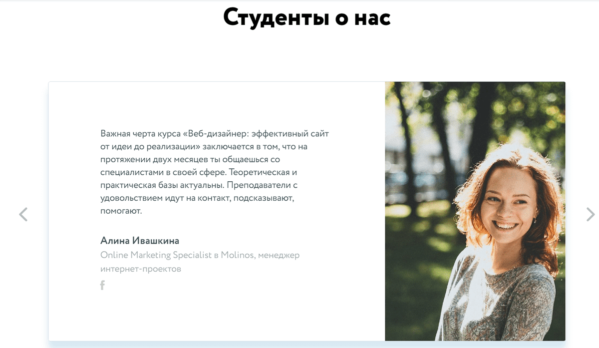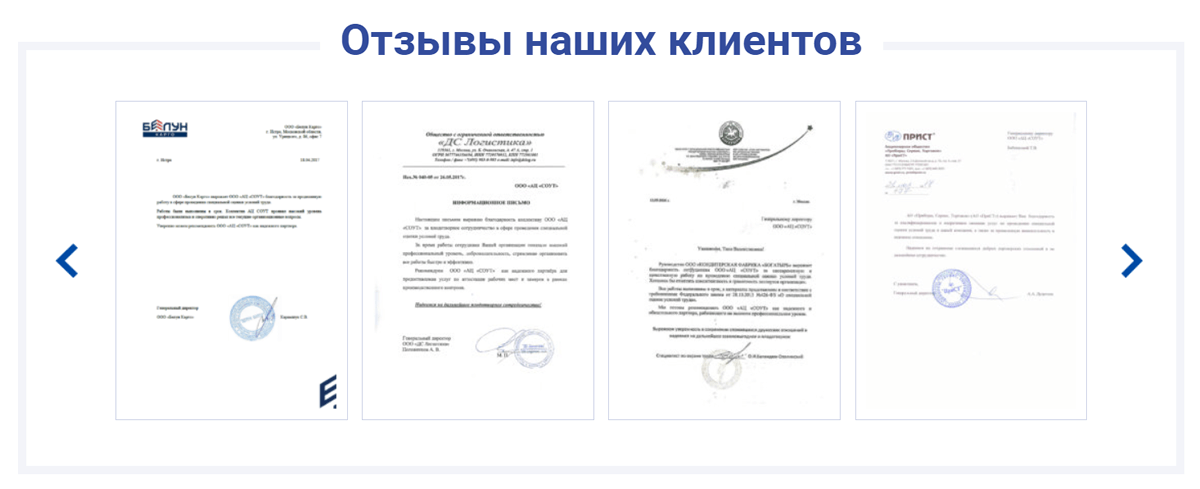 Не забудьте об отзывах клиентов. Это тоже положительно скажется на доверии пользователей к вашей организации. Желательно, чтобы они были реальными и дополнялись фото. Если вы работаете в сегменте В2В, можно использовать отсканированные благодарственные письма или логотипы партнёров.