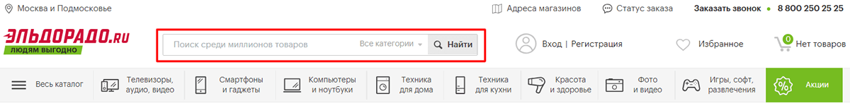 Ещё один важный момент: если вы предлагаете разнообразные товары в большом количестве, в шапке стоит предусмотреть форму поиска. Это позволит гостю быстрее и проще найти интересующую его продукцию.