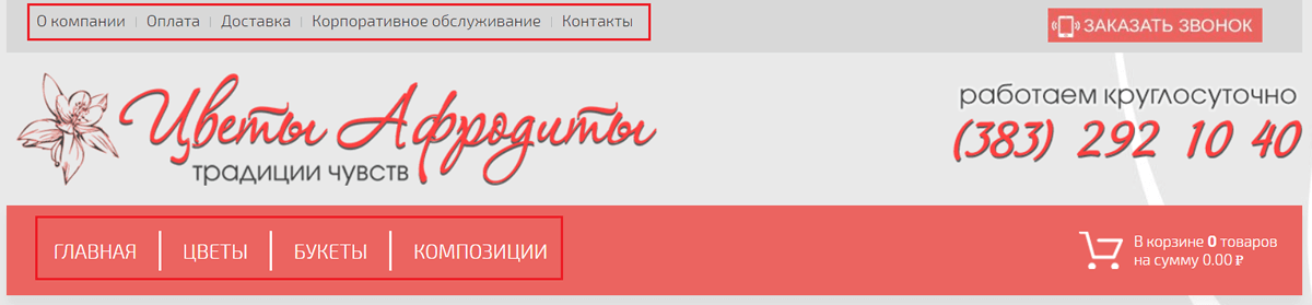 В меню нужно прописать основные разделы вашего интернет-ресурса, это позволит пользователю быстрее сориентироваться и спланировать переходы на другие страницы. Достаточно будет 5-7 ссылок. Если же их должно быть больше, можно разбить меню на две составляющие: над шапкой указать вспомогательные разделы, а под ней − основные.