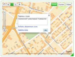 Теперь самая важная и ответственная задача – найти точку, которую необходимо отметить на карте. Искать будем мой университет – Смоленский Гуманитарный Университет. Для этого приближаем или увеличиваем масштаб и перемещаемся по улицам города. Я нашёл, а вы? Теперь отметим здание точкой и подпишем как необходимо.