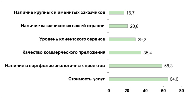 Вторым по значимости критерием стало наличие в портфолио проектов, аналогичных тому, котрый предполагается заказать. Так 58,3% опрошенных считают важным размещать заказ в той студии, которая уже делала подобные проекты. Можно предположить, что именно этот критерий является определяющим, в отличие от «пристрелочной» оценки по стоимости услуг.