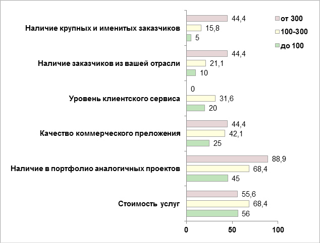 Как можем видеть на гистограмме, заказчики проектов в диапазоне до 100 000 руб. имеют существенный плюрализм в вопросе оценки подрядчика: все пункты оказываются менее важными, нежели цена, но и ценовой параметр отмечает лишь чуть более половины опрошенных. Это означает, что у представителей этого сегмента нет единого мнения об абсолютной важности какого-либо конкретного критерия. Такое положение существенно демократизирует рынок «недорогих» проектов: подрядчик с любым набором достоинств получает шанс найти «своего» клиента.