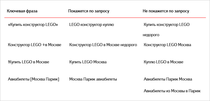 - " " (кавычки). Позволяют показывать рекламу только тем пользователям, чей поисковый запрос почти совпадает с ключевой фразой — то есть в нём используются те же слова, но, возможно, в другом порядке и в других формах. При этом стоп-слова учитываются.