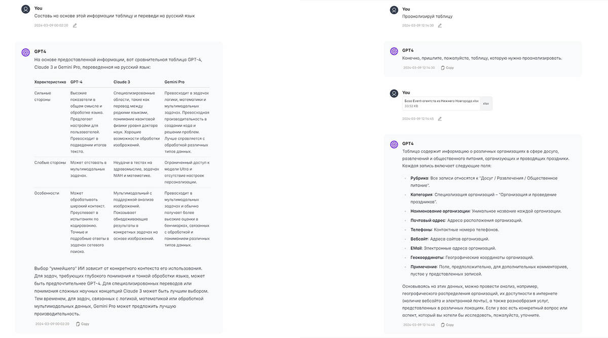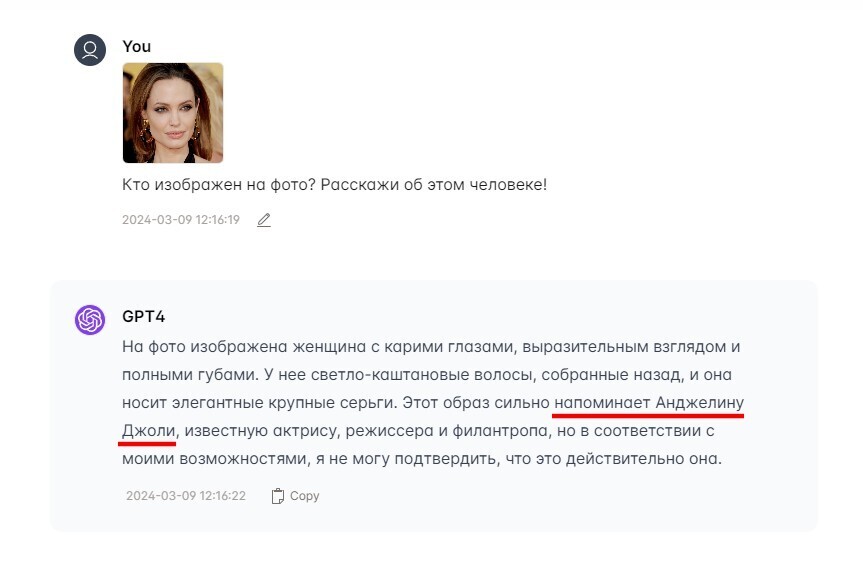 Что касается работы с файлами, здесь всё без нареканий (в отличие от «Клода»). Сначала я отправил GPT Excel-таблицу с организациями, которые когда-то собрал из 2GIS. ИИ проанализировал ее и написал вкратце, что она содержит. Также он предложил дальнейшие действия, которые может выполнить с данной таблицей. Отправив фото Анджелины Джоли, я попросил нейросеть сказать, кто изображен на снимке. С этой задачей Chat GPT также справился на 5+. Он описал женщину на изображении и даже сумел распознать в ней саму актрису, хоть и без 100-процентной уверенности в правоте.