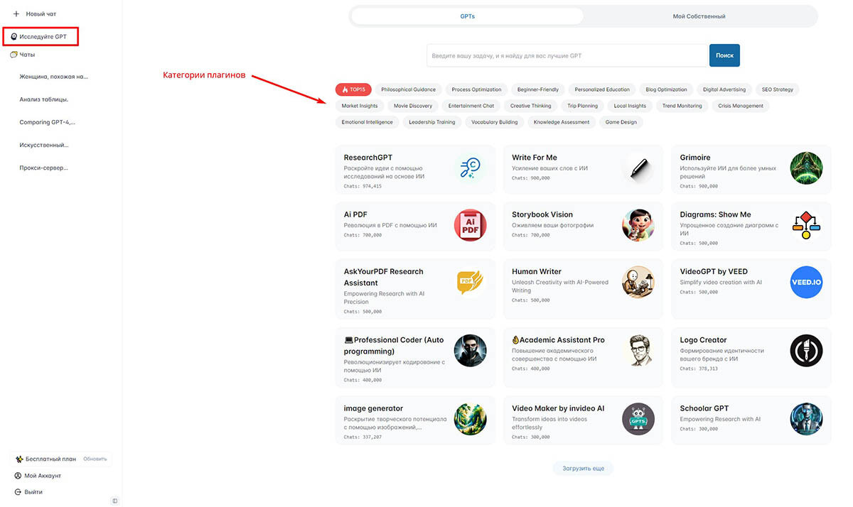 Если перед вами стоит конкретная задача и вы знаете, что для ее решения вам нужен определенный плагин, нажмите на пункт «Исследуйте GPT» в боковой панели! Откроется страница со всеми доступными дополнениями. Они распределены по двум десяткам категорий. Вы можете выбрать подходящую и ознакомиться с имеющимися там GPTS.