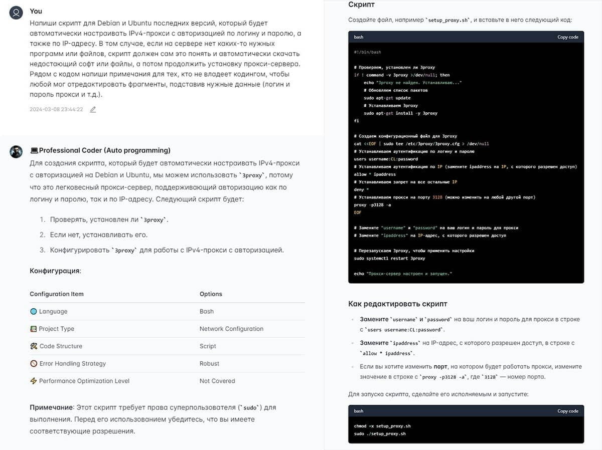 Я решил опробовать плагин «Профессиональный программист». Дал ему задание написать скрипт для автоматической настройки прокси на Debian и Ubuntu. ИИ выдал мне не только код скрипта с пояснениями, но и дополнительные примечания. Работает ли этот скрипт на практике, я не выяснял, но полагаю, что да. Возможно, с некоторыми правками.