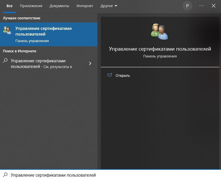 Теперь нажимаем Пуск и вводим «Управление сертификатами пользователей»