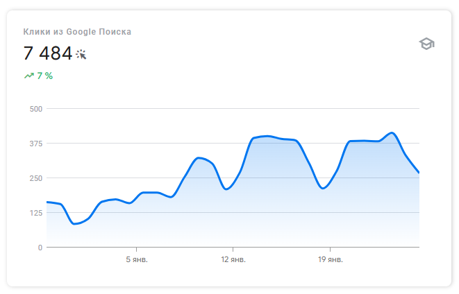 Эффективность. Представлены данные о том, сколько кликов получил сайт за месяц в Google Поиске и общее количество кликов.