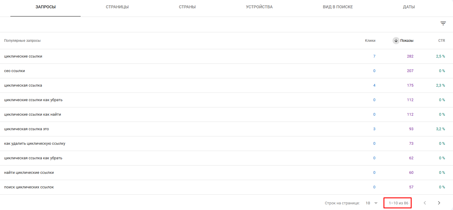 Указанная страница ранжируется по 86 запросам. Больше всего показов и кликов было по запросу «циклические ссылки».