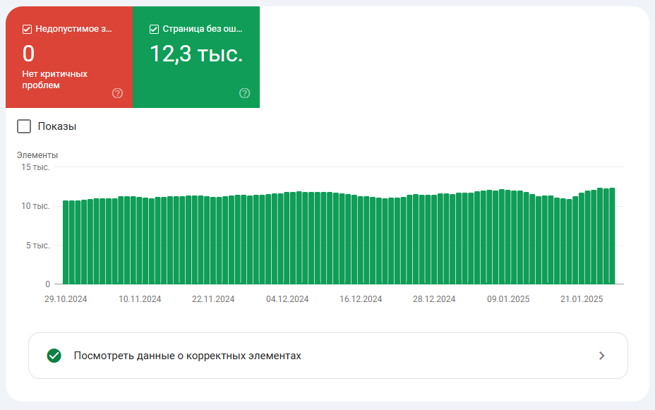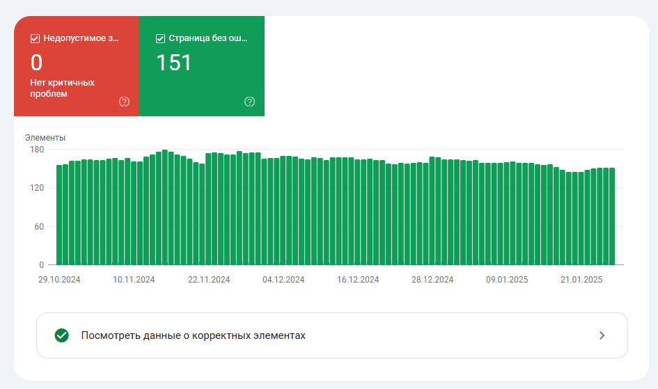 Из этой группы отчетов можно узнать, какие данные для расширенных результатов Google смог найти в контенте страниц, и есть ли в этих данных ошибки.