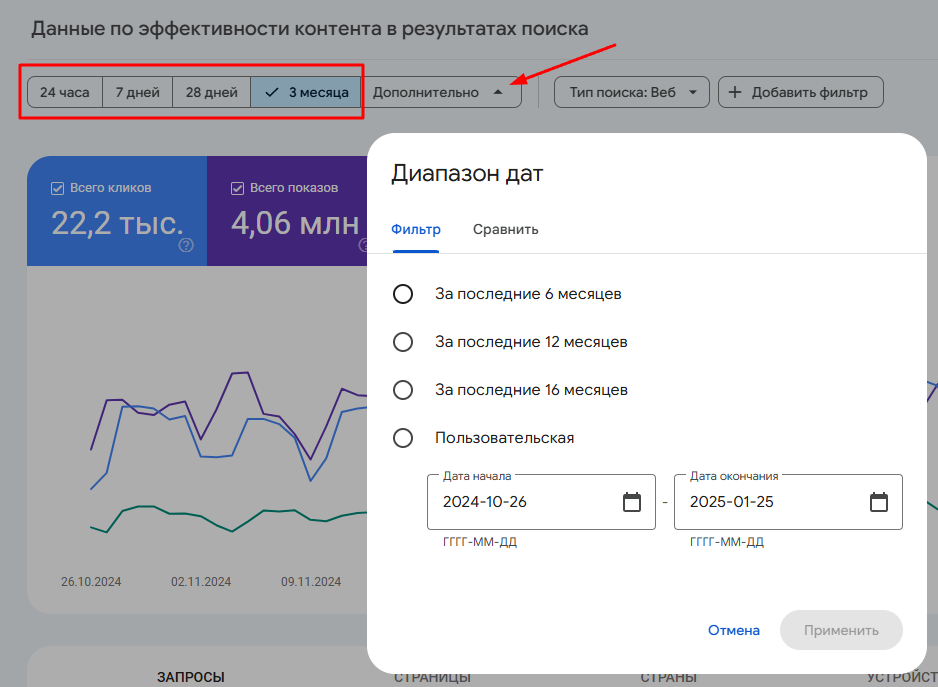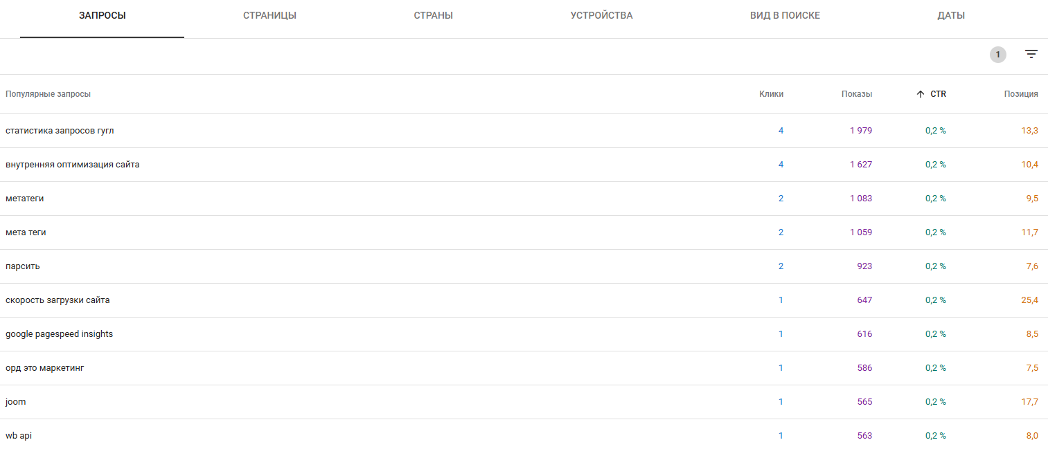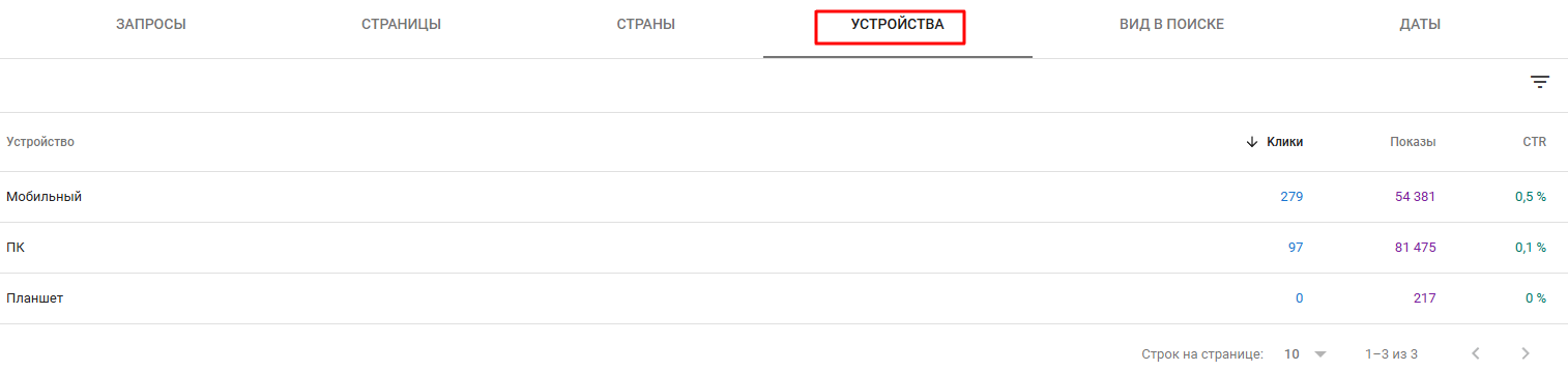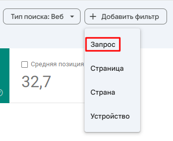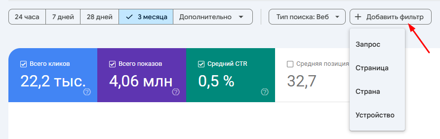 В Search Console можно посмотреть статистику по конкретному запросу, странице, стране и устройству. Для этого нужно воспользоваться фильтром: