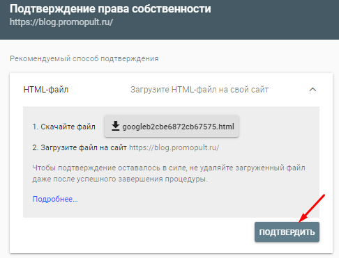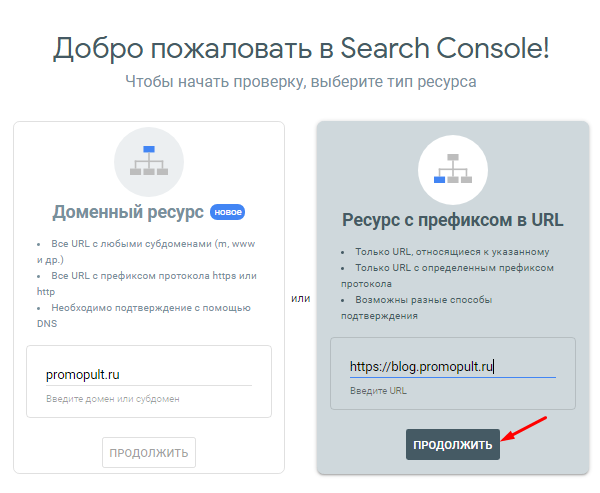 Ресурс с префиксом в URL. Проверка прав осуществляется только по конкретному адресу с определенным протоколом. Например, только по адресу https://blog.promopult.ru. В этом случае возможны разные способы подтверждения.