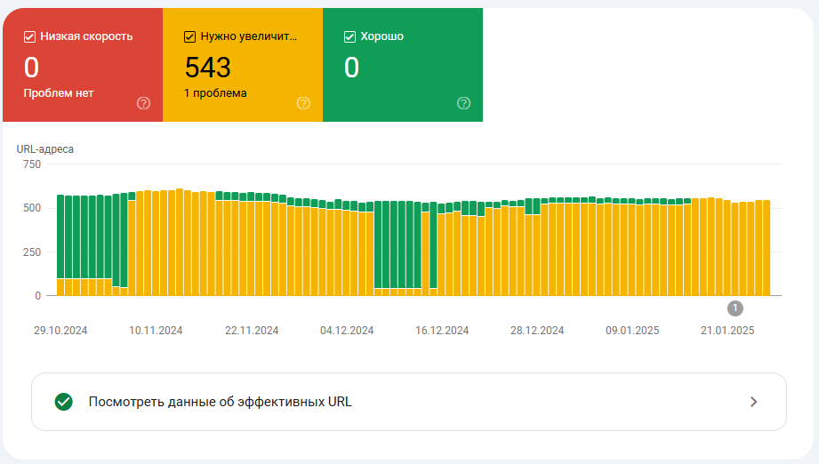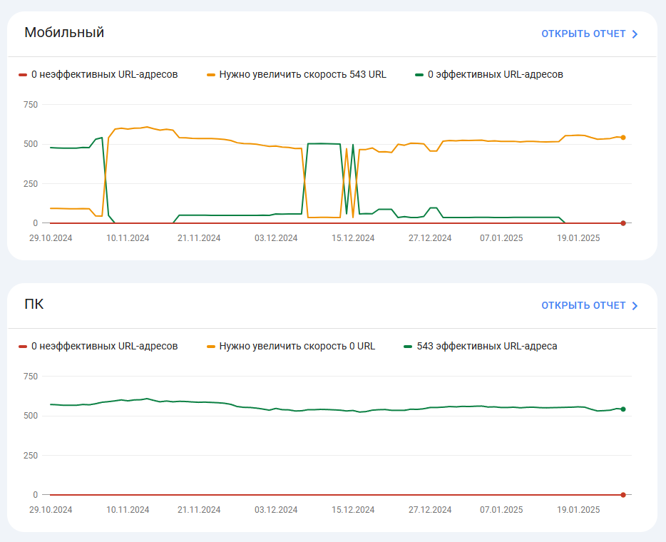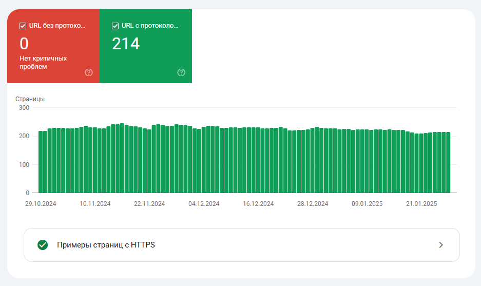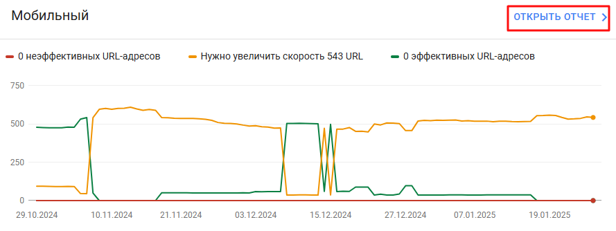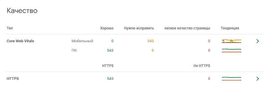 Качество. Сведения о соответствии страниц сайта показателям Core Web Vitals и URL, которые поддерживают защищенный протокол HTTPS.
