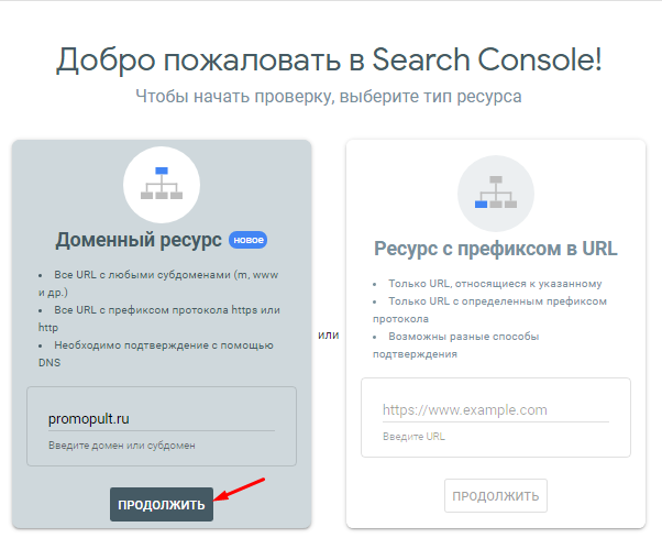 Доменный ресурс. Проверяется не отдельный протокол, а весь ресурс, в том числе все домены, протоколы и директории. Например, при добавлении ресурса promopult.ru, проверка будет распространяться и на его поддомен – blog.promopult.ru. Подтвердить права на доменный ресурс можно только с помощью DNS.