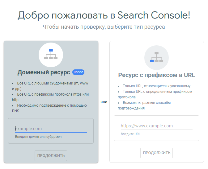 Авторизуемся в Google, переходим в Google Search Console и для начала выбираем тип ресурса, который нужно добавить. От этого зависят способы, которыми можно подтвердить права на него.