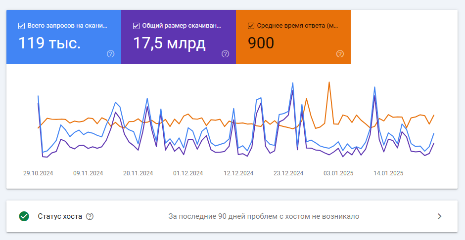 На графике «Статистика сканирования» отображена динамика запросов на сканирование, общий размер скачанных файлов в байтах и среднее время ответа на запрос сканирования страницы в миллисекундах.