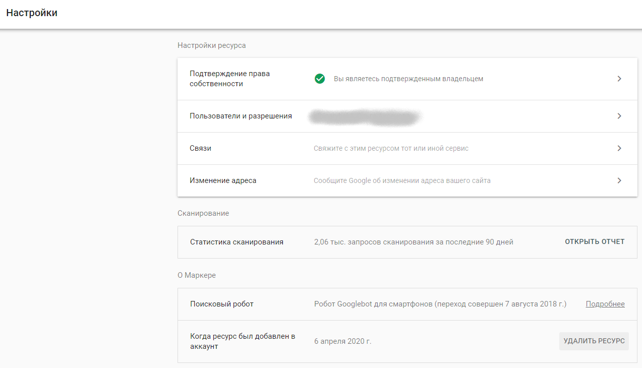 О Маркере. Здесь указан тип поискового робота (чаще всего, для компьютеров или смартфонов) и дата добавления ресурса в аккаунт Search Console. Тут же есть возможность удалить ресурс из аккаунта.
