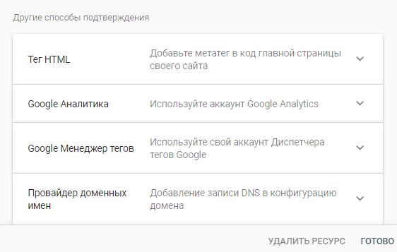 Другие способы подтверждения. Можно добавить тег HTML в код главной страницы, добавить в код главной страницы фрагмент кода analytics.js или gtag.js., использовать аккаунт Диспетчера тегов, добавить записи DNS в конфигурацию домена.