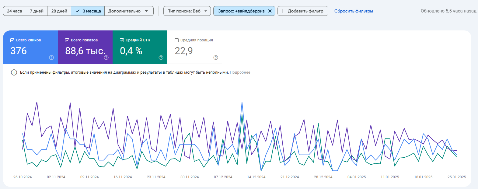 Получаем линейный график по ключевым запросам, содержащим слово «вайлдберриз»: