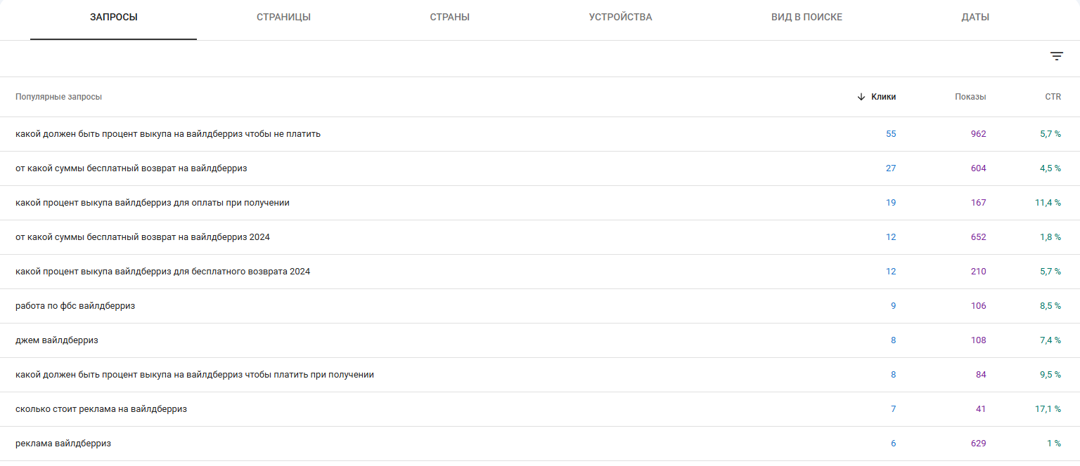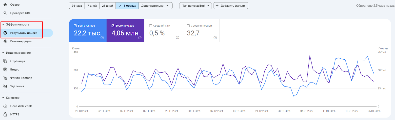 Это ключевой отчет для SEO-специалистов. Основная информация содержится в разделе «Результаты поиска».